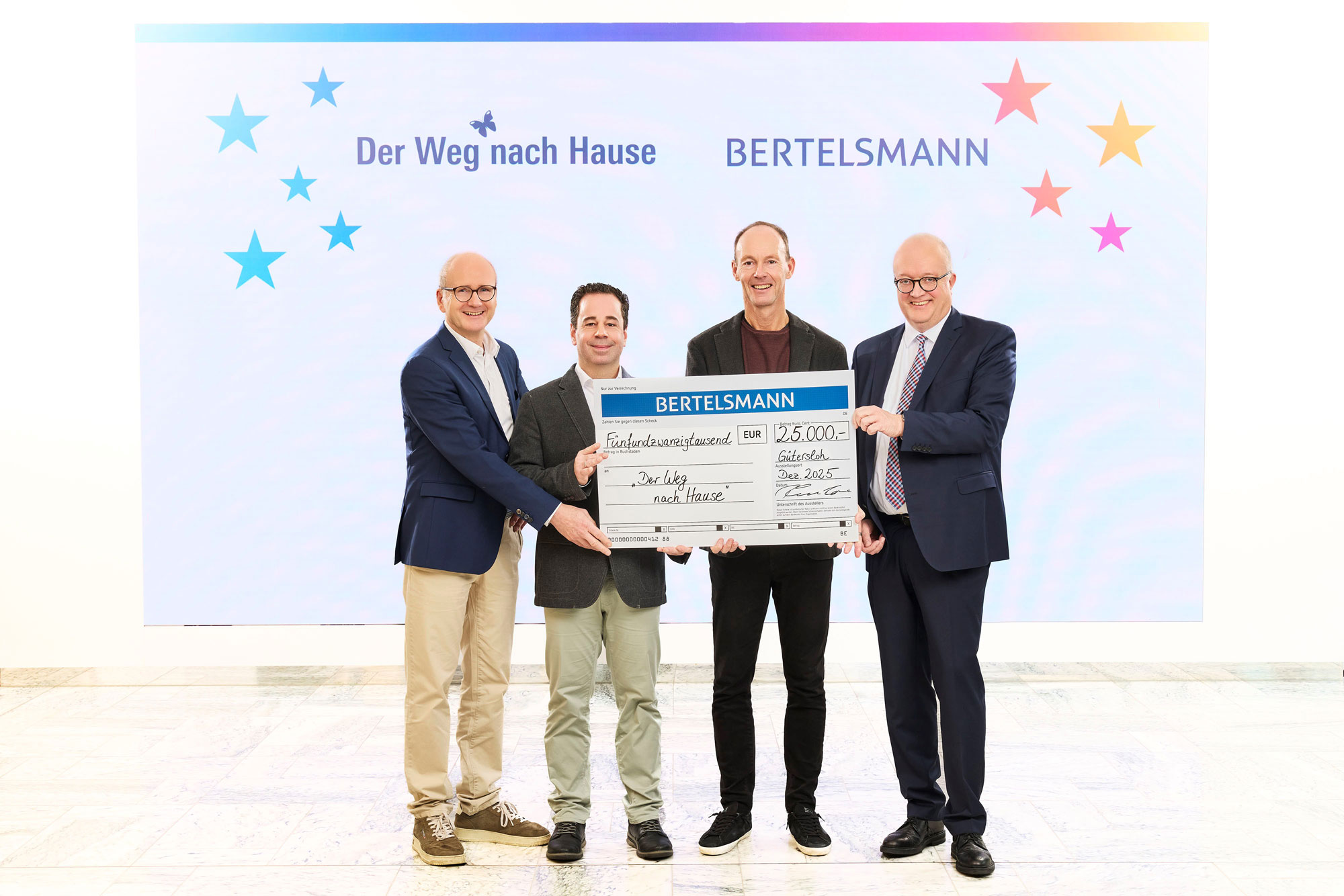 Die diesjährige Scheckübergabe fand im Corporate Center von Bertelsmann in Gütersloh statt. Neben bekannten Vertretern aus Bethel nahm in diesem Jahr Christoph Nolting, der neue Finanzvorstand der v. Bodelschwinghschen Stiftungen Bethel, erstmals an der Übergabe teil. Von Bethel ebenfalls anwesend waren Univ.-Prof. Dr. Eckard Hamelmann, Direktor der Universitätsklinik für Kinder- und Jugendmedizin am Kinderzentrum Bethel, sowie Stefan Schwalfenberg, leitender Arzt des ambulanten Palliativteams „Der Weg nach Hause“.